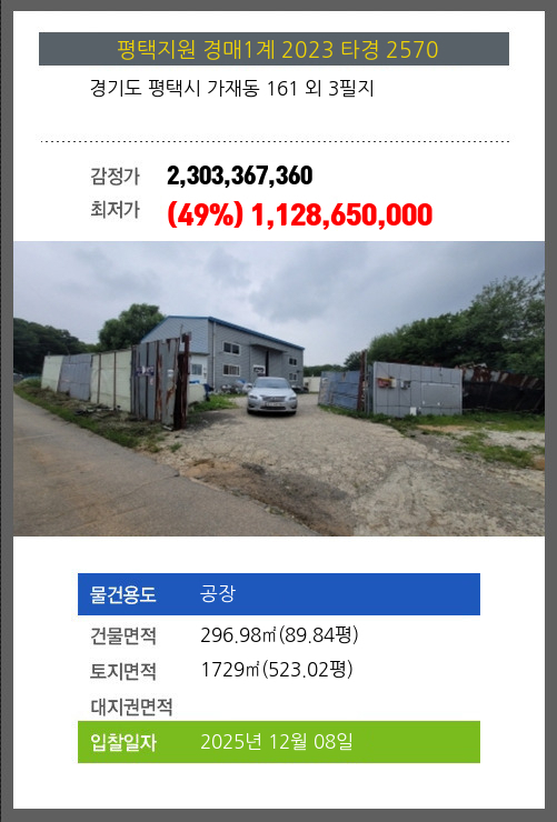 사건번호 2023 타경 2570 본건은 경기도 평택시 가재동 161 외 3필지소재하는 공장경매 물건의 포스팅입니다. 건물면적 [ 296.98㎡ (89.84평) ]토지면적 [ 1729㎡ (523.02평) ] 시세를 반영한