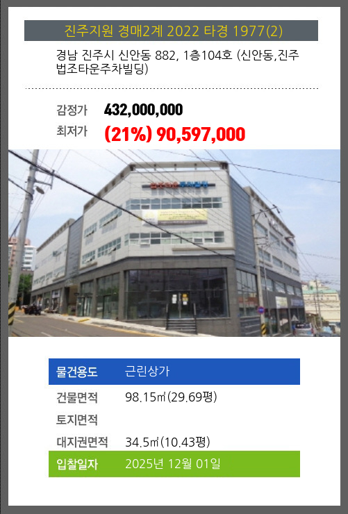 사건번호 2022 타경 1977(2) 본건은 경남 진주시 신안동 882, 1층104호 (신안동,진주법조타운주차빌딩)소재하는 근린상가경매 물건의 포스팅입니다. 건물면적 [ 98.15㎡ (29.69평) ]대지권 [ 34.5㎡ (10.43평) ] 시세를 반영한