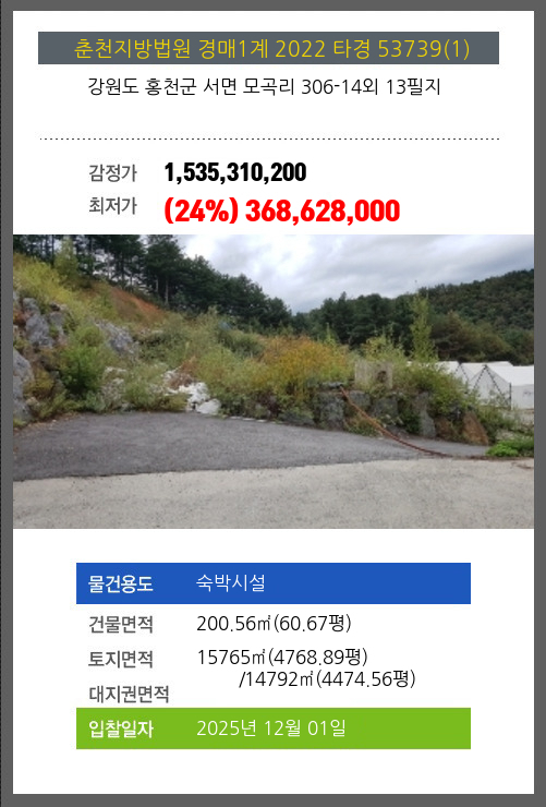 사건번호 2022 타경 53739(1) 본건은 강원도 홍천군 서면 모곡리 306-14외 13필지소재하는 숙박시설경매 물건의 포스팅입니다. 건물면적 [ 200.56㎡ (60.67평) ]토지면적 [ 전체:15765㎡ (4768.89평) 매각지분:14792㎡ (4474.56평) ]