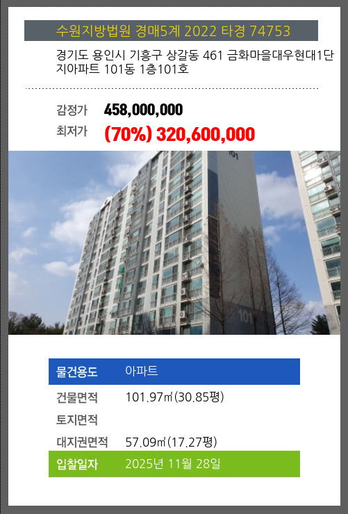 사건번호 2022 타경 74753 본건은 경기도 용인시 기흥구 상갈동 461 금화마을대우현대1단지아파트 101동 1층101호소재하는 아파트경매 물건의 포스팅입니다. 건물면적 [ 101.97㎡ (30.85평) ]대지권 [ 57.09㎡ (17.27평) ]