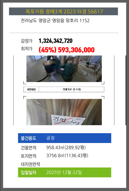 사건번호 2023 타경 56617 본건은 전라남도 영암군 영암읍 망호리 1152소재하는 공장경매 물건의 포스팅입니다. 건물면적 [ 958.43㎡ (289.92평) ]토지면적 [ 3756.8㎡ (1136.43평) ] 시세를 반영한 감정가