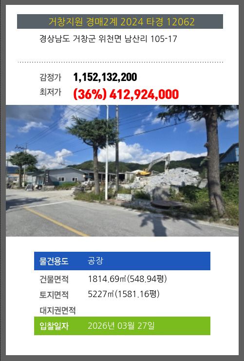 사건번호 2024 타경 12062 본건은 경상남도 거창군 위천면 남산리 105-17소재하는 공장경매 물건의 포스팅입니다. 건물면적 [ 1814.69㎡ (548.94평) ]토지면적 [ 5227㎡ (1581.16평) ] 시세를 반영한 감정가