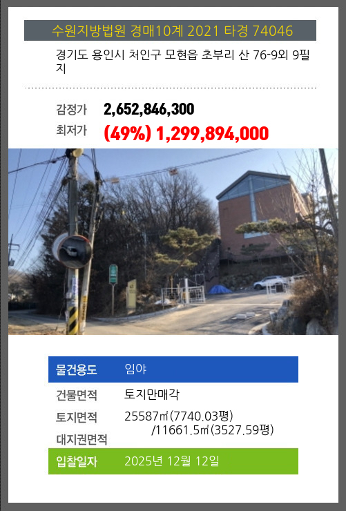 사건번호 2021 타경 74046 본건은 경기도 용인시 처인구 모현읍 초부리 산 76-9외 9필지소재하는 임야경매 물건의 포스팅입니다. 건물면적 [ 토지만매각 ]토지면적 [ 전체:25587㎡ (7740.03평) 매각지분:11661.5㎡ (3527.59평)