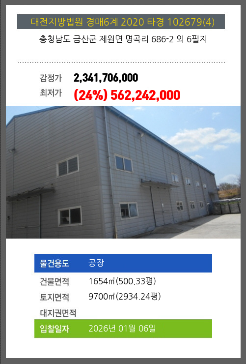사건번호 2020 타경 102679(4) 본건은 충청남도 금산군 제원면 명곡리 686-2 외 6필지소재하는 공장경매 물건의 포스팅입니다. 건물면적 [ 1654㎡ (500.33평) ]토지면적 [ 9700㎡ (2934.24평) ] 시세를