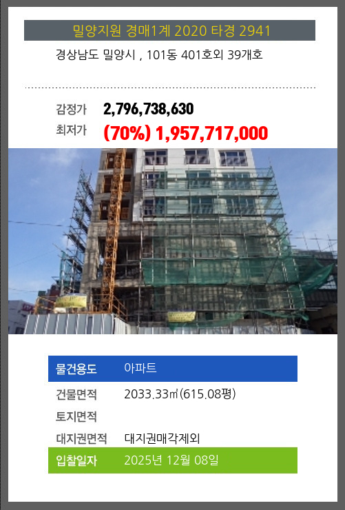사건번호 2020 타경 2941 본건은 경상남도 밀양시 , 101동 401호외 39개호소재하는 아파트경매 물건의 포스팅입니다. 건물면적 [ 2033.33㎡ (615.08평) ]대지권 [ 대지권 매각제외 ] 시세를 반영한