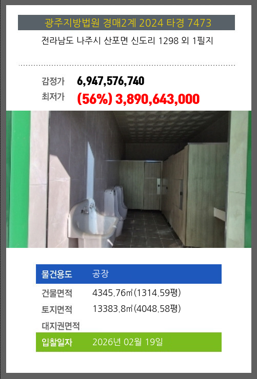 사건번호 2024 타경 7473 본건은 전라남도 나주시 산포면 신도리 1298 외 1필지소재하는 공장경매 물건의 포스팅입니다. 건물면적 [ 4345.76㎡ (1314.59평) ]토지면적 [ 13383.8㎡ (4048.58평) ] 시세를