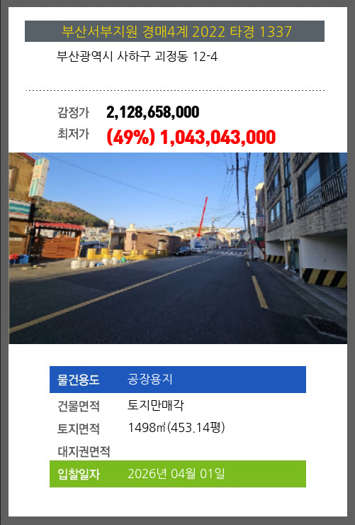 사건번호 2022 타경 1337 본건은 부산광역시 사하구 괴정동 12-4소재하는 공장용지경매 물건의 포스팅입니다. 건물면적 [ 토지만매각 ]토지면적 [ 1498㎡ (453.14평) ] 시세를 반영한 감정가 2,128,658,000에서3회 유찰되어