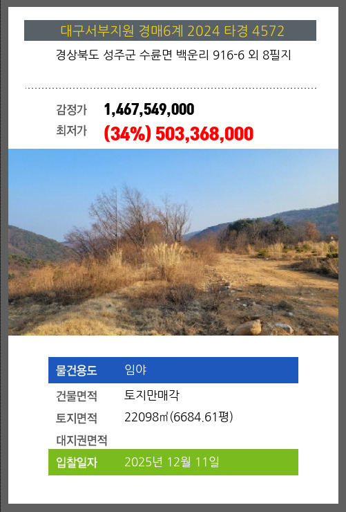 사건번호 2024 타경 4572 본건은 경상북도 성주군 수륜면 백운리 916-6 외 8필지소재하는 임야경매 물건의 포스팅입니다. 건물면적 [ 토지만매각 ]토지면적 [ 22098㎡ (6684.61평) ] 시세를 반영한