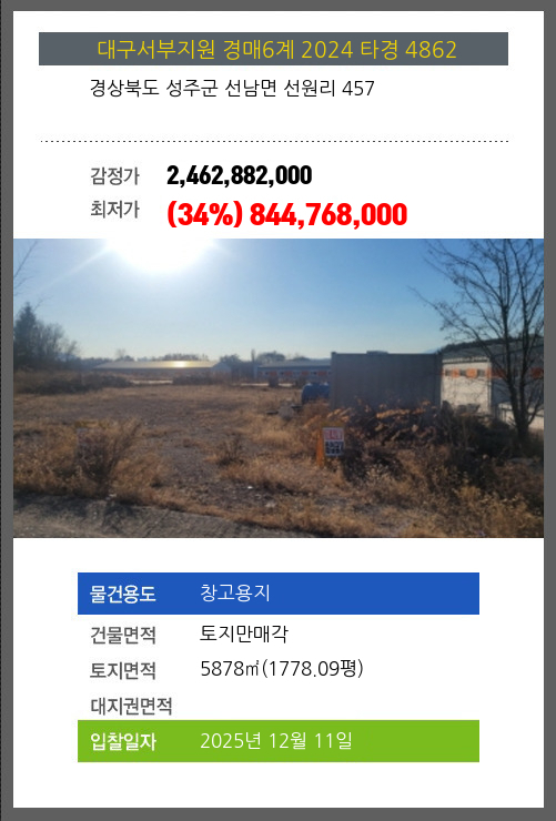 사건번호 2024 타경 4862 본건은 경상북도 성주군 선남면 선원리 457소재하는 창고용지경매 물건의 포스팅입니다. 건물면적 [ 토지만매각 ]토지면적 [ 5878㎡ (1778.09평) ] 시세를 반영한 감정가 2,462,882,000에서3회