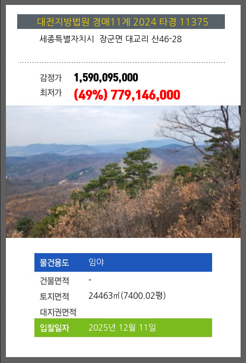 사건번호 2024 타경 11375 본건은 세종특별자치시 장군면 대교리 산46-28소재하는 임야경매 물건의 포스팅입니다. 토지면적 [ 24463㎡ (7400.02평) ] 시세를 반영한 감정가 1,590,095,000에서2회 유찰되어 감정가 대비 49%최저가