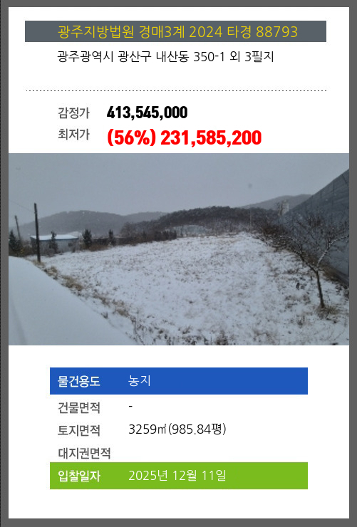 사건번호 2024 타경 88793 본건은 광주광역시 광산구 내산동 350-1 외 3필지소재하는 농지경매 물건의 포스팅입니다. 토지면적 [ 3259㎡ (985.84평) ] 시세를 반영한 감정가 413,545,000에서2회 유찰되어 감정가