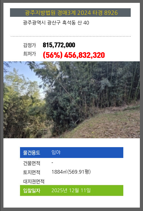 사건번호 2024 타경 8926 본건은 광주광역시 광산구 흑석동 산 40소재하는 임야경매 물건의 포스팅입니다. 토지면적 [ 1884㎡ (569.91평) ] 시세를 반영한 감정가 815,772,000에서2회 유찰되어 감정가 대비
