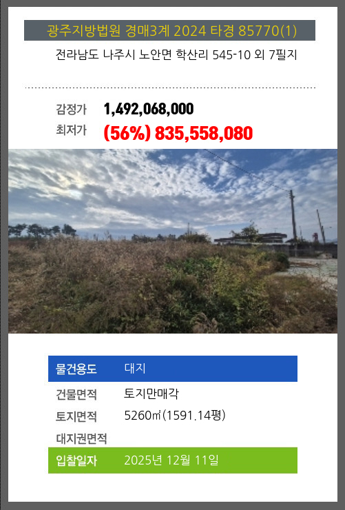 사건번호 2024 타경 85770(1) 본건은 전라남도 나주시 노안면 학산리 545-10 외 7필지소재하는 대지경매 물건의 포스팅입니다. 건물면적 [ 토지만매각 ]토지면적 [ 5260㎡ (1591.14평) ] 시세를 반영한