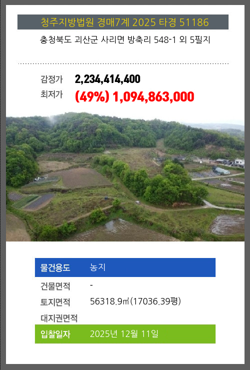 사건번호 2025 타경 51186 본건은 충청북도 괴산군 사리면 방축리 548-1 외 5필지소재하는 농지경매 물건의 포스팅입니다. 토지면적 [ 56318.9㎡ (17036.39평) ] 시세를 반영한 감정가 2,234,414,400에서2회 유찰되어