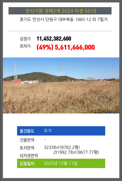 사건번호 2024 타경 5618 본건은 경기도 안산시 단원구 대부북동 1865-12 외 7필지소재하는 유지경매 물건의 포스팅입니다. 토지면적 [ 전체:32338㎡ (9782.2평) 매각지분:31992.78㎡ (9677.77평) ] 시세를 반영한 감정가