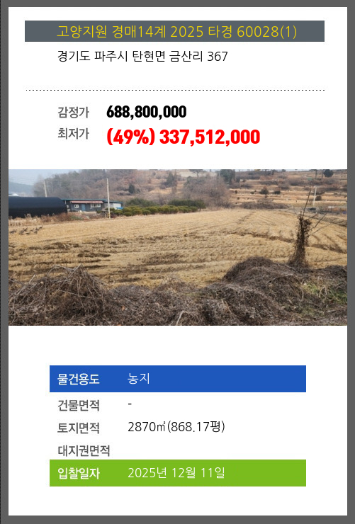 사건번호 2025 타경 60028(1) 본건은 경기도 파주시 탄현면 금산리 367소재하는 농지경매 물건의 포스팅입니다. 토지면적 [ 2870㎡ (868.17평) ] 시세를 반영한 감정가 688,800,000에서2회 유찰되어 감정가 대비
