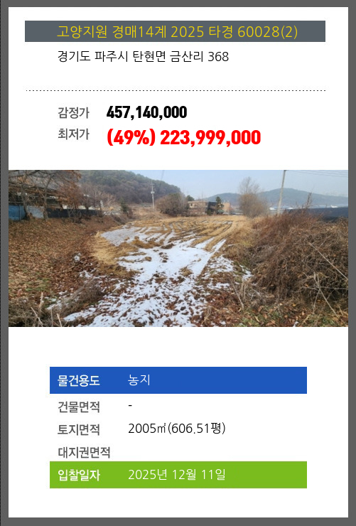 사건번호 2025 타경 60028(2) 본건은 경기도 파주시 탄현면 금산리 368소재하는 농지경매 물건의 포스팅입니다. 토지면적 [ 2005㎡ (606.51평) ] 시세를 반영한 감정가 457,140,000에서2회 유찰되어 감정가 대비
