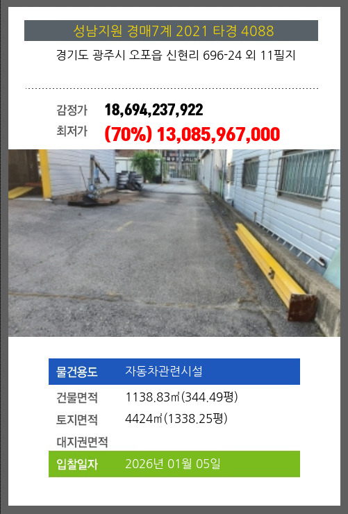 사건번호 2021 타경 4088 본건은 경기도 광주시 오포읍 신현리 696-24 외 11필지소재하는 자동차관련시설경매 물건의 포스팅입니다. 건물면적 [ 1138.83㎡ (344.49평) ]토지면적 [ 4424㎡ (1338.25평) ] 시세를