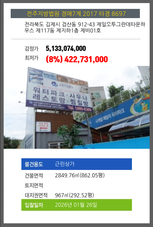 사건번호 2017 타경 8697 본건은 전라북도 김제시 검산동 912-43 제일오투그란데타운하우스 제117동 제지하1층 제비01호소재하는 근린상가경매 물건의 포스팅입니다. 건물면적 [ 2849.76㎡ (862.05평) ]대지권 [ 967㎡ (292.52평) ]