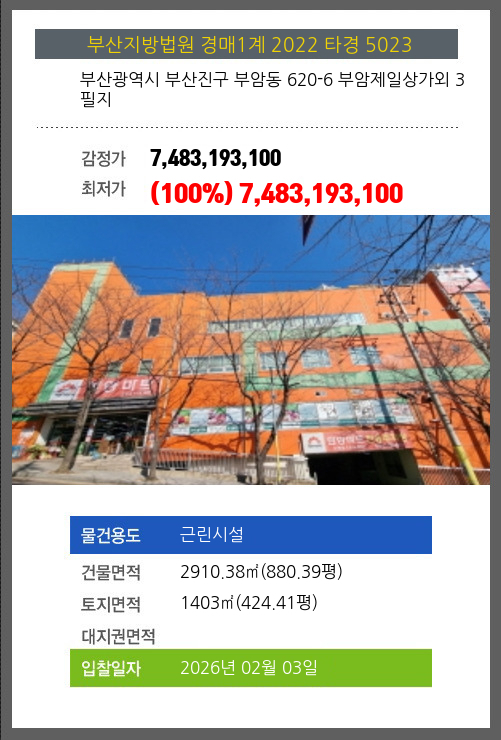 사건번호 2022 타경 5023 본건은 부산광역시 부산진구 부암동 620-6 부암제일상가외 3필지소재하는 근린시설경매 물건의 포스팅입니다. 건물면적 [ 2910.38㎡ (880.39평) ]토지면적 [ 1403㎡ (424.41평) ] 시세를 반영한