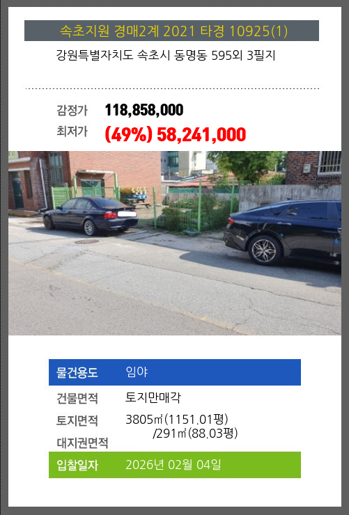 사건번호 2021 타경 10925(1) 본건은 강원특별자치도 속초시 동명동 595외 3필지소재하는 임야경매 물건의 포스팅입니다. 건물면적 [ 토지만매각 ]토지면적 [ 전체:3805㎡ (1151.01평) 매각지분:291㎡ (88.03평) ] 시세를 반영한