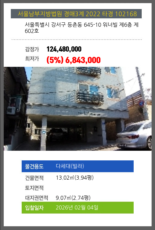 사건번호 2022 타경 102168 본건은 서울특별시 강서구 등촌동 645-10 워너빌 제6층 제602호소재하는 다세대(빌라)경매 물건의 포스팅입니다. 건물면적 [ 13.02㎡ (3.94평) ]대지권 [ 9.07㎡ (2.74평) ] 시세를