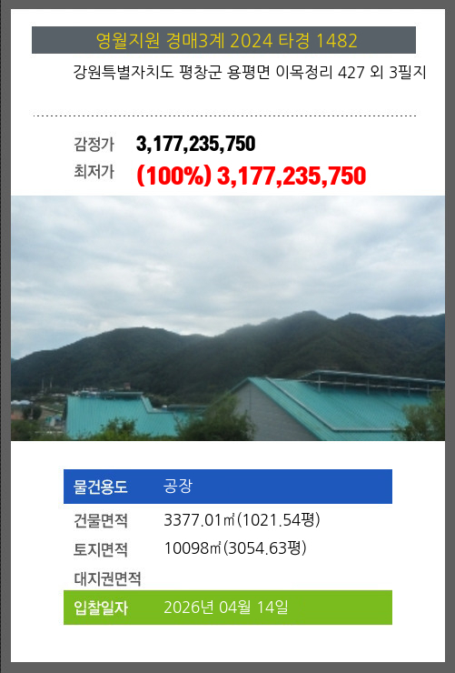사건번호 2024 타경 1482 본건은 강원특별자치도 평창군 용평면 이목정리 427 외 3필지소재하는 공장경매 물건의 포스팅입니다. 건물면적 [ 3377.01㎡ (1021.54평) ]토지면적 [ 10098㎡ (3054.63평) ] 시세를