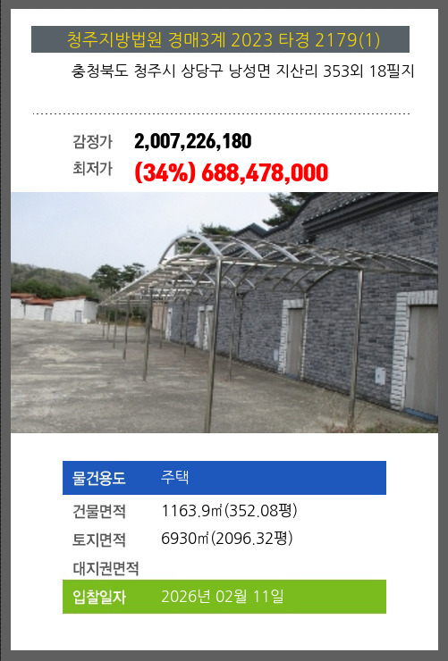 사건번호 2023 타경 2179(1) 본건은 충청북도 청주시 상당구 낭성면 지산리 353외 18필지소재하는 주택경매 물건의 포스팅입니다. 건물면적 [ 1163.9㎡ (352.08평) ]토지면적 [ 6930㎡ (2096.32평) ] 시세를