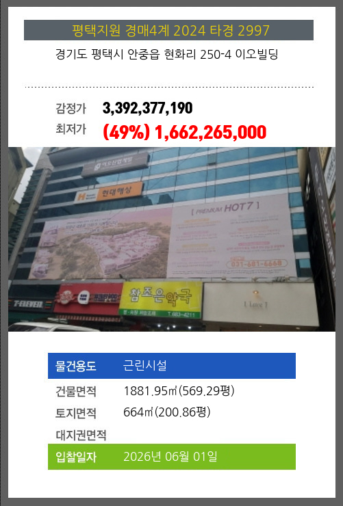 사건번호 2024 타경 2997 본건은 경기도 평택시 안중읍 현화리 250-4 이오빌딩소재하는 근린시설경매 물건의 포스팅입니다. 건물면적 [ 1793.39㎡ (542.5평) ]토지면적 [ 664㎡ (200.86평) ] 시세를 반영한