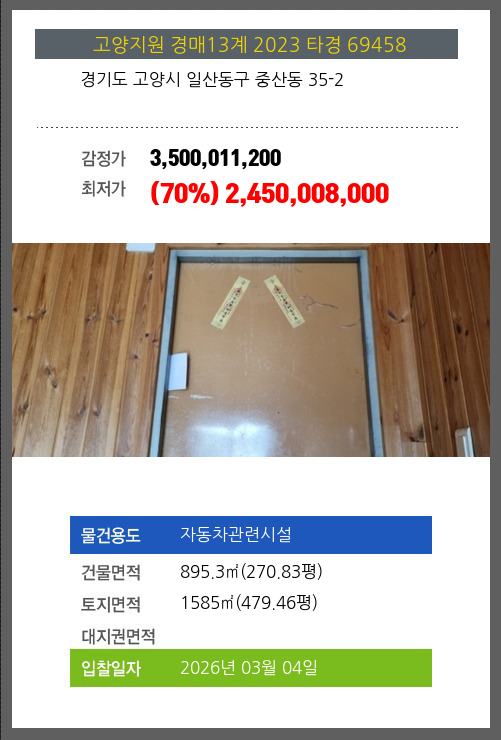 사건번호 2023 타경 69458 본건은 경기도 고양시 일산동구 중산동 35-2소재하는 자동차관련시설경매 물건의 포스팅입니다. 건물면적 [ 895.3㎡ (270.83평) ]토지면적 [ 1585㎡ (479.46평) ] 시세를 반영한 감정가