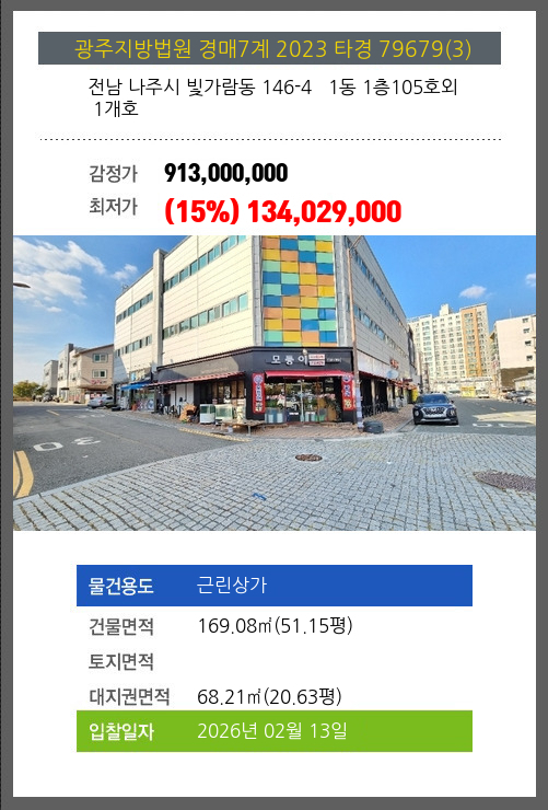 사건번호 2023 타경 79679(3) 본건은 전남 나주시 빛가람동 146-4 1동 1층105호외 1개호소재하는 근린상가경매 물건의 포스팅입니다. 건물면적 [ 169.08㎡ (51.15평) ]대지권 [ 68.21㎡ (20.63평) ] 시세를