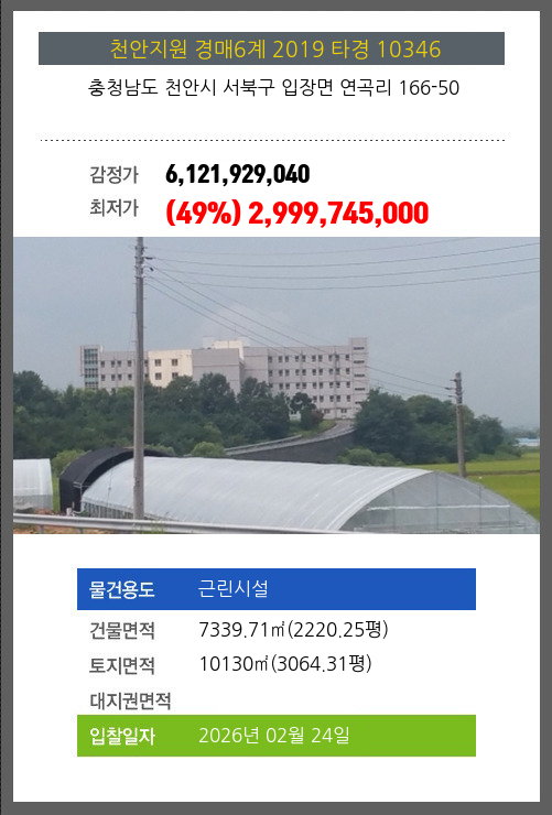 사건번호 2019 타경 10346 본건은 충청남도 천안시 서북구 입장면 연곡리 166-50소재하는 근린시설경매 물건의 포스팅입니다. 건물면적 [ 7339.71㎡ (2220.25평) ]토지면적 [ 10130㎡ (3064.31평) ] 시세를 반영한