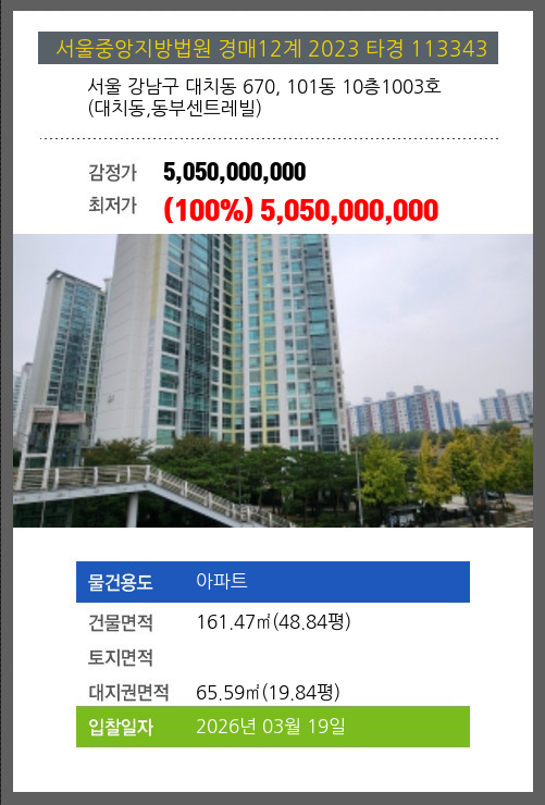 사건번호 2023 타경 113343 본건은 서울 강남구 대치동 670, 101동 10층1003호 (대치동,동부센트레빌)소재하는 아파트경매 물건의 포스팅입니다. 건물면적 [ 161.47㎡ (48.84평) ]대지권 [ 65.59㎡ (19.84평) ] 시세를