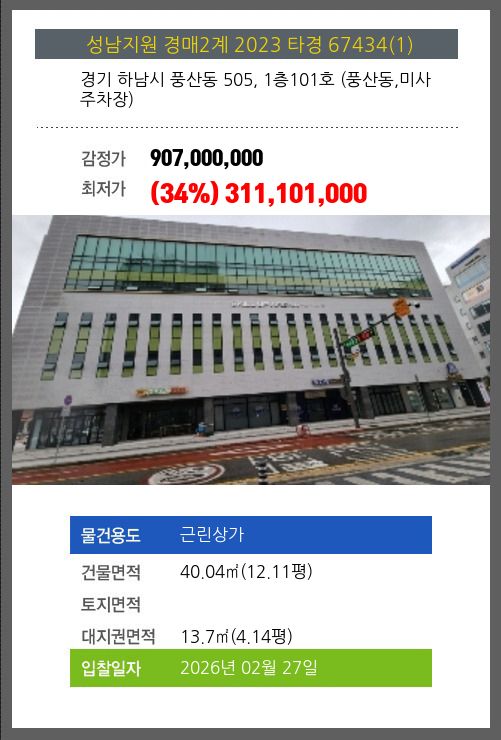사건번호 2023 타경 67434(1) 본건은 경기 하남시 풍산동 505, 1층101호 (풍산동,미사주차장)소재하는 근린상가경매 물건의 포스팅입니다. 건물면적 [ 40.04㎡ (12.11평) ]대지권 [ 13.7㎡ (4.14평) ] 시세를 반영한