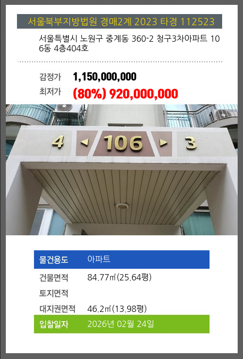 사건번호 2023 타경 112523 본건은 서울특별시 노원구 중계동 360-2 청구3차아파트 106동 4층404호소재하는 아파트경매 물건의 포스팅입니다. 건물면적 [ 84.77㎡ (25.64평) ]대지권 [ 46.2㎡ (13.98평) ] 시세를