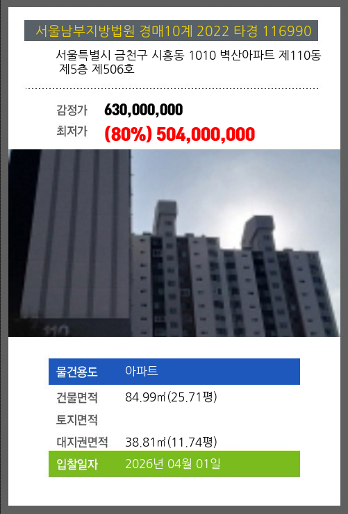 사건번호 2022 타경 116990 본건은 서울특별시 금천구 시흥동 1010 벽산아파트 제110동 제5층 제506호소재하는 아파트경매 물건의 포스팅입니다. 건물면적 [ 84.99㎡ (25.71평) ]대지권 [ 38.81㎡ (11.74평) ]