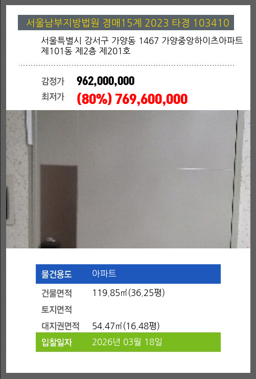 사건번호 2023 타경 103410 본건은 서울특별시 강서구 가양동 1467 가양중앙하이츠아파트 제101동 제2층 제201호소재하는 아파트경매 물건의 포스팅입니다. 건물면적 [ 119.85㎡ (36.25평) ]대지권 [ 54.47㎡ (16.48평) ]