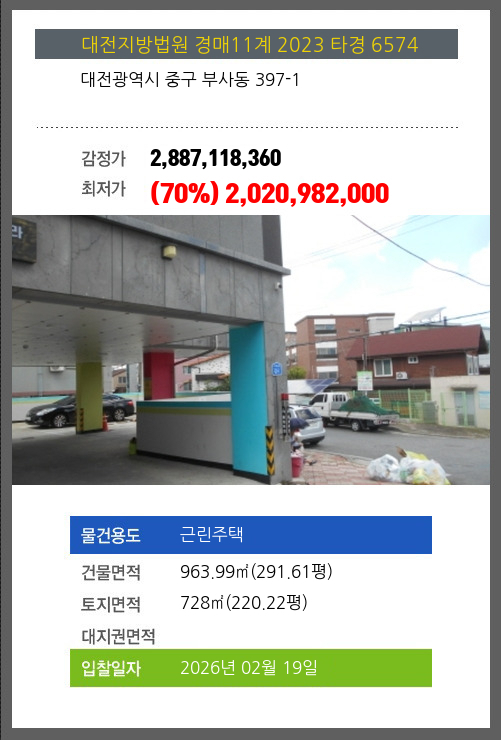 사건번호 2023 타경 6574 본건은 대전광역시 중구 부사동 397-1소재하는 근린주택경매 물건의 포스팅입니다. 건물면적 [ 963.99㎡ (291.61평) ]토지면적 [ 728㎡ (220.22평) ] 시세를 반영한 감정가 2,887,118,360에서2회