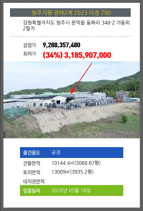 사건번호 2023 타경 790 본건은 강원특별자치도 원주시 문막읍 동화리 348-2 가동외 2필지소재하는 공장경매 물건의 포스팅입니다. 건물면적 [ 10144.4㎡ (3068.67평) ]토지면적 [ 13009㎡ (3935.2평) ] 시세를