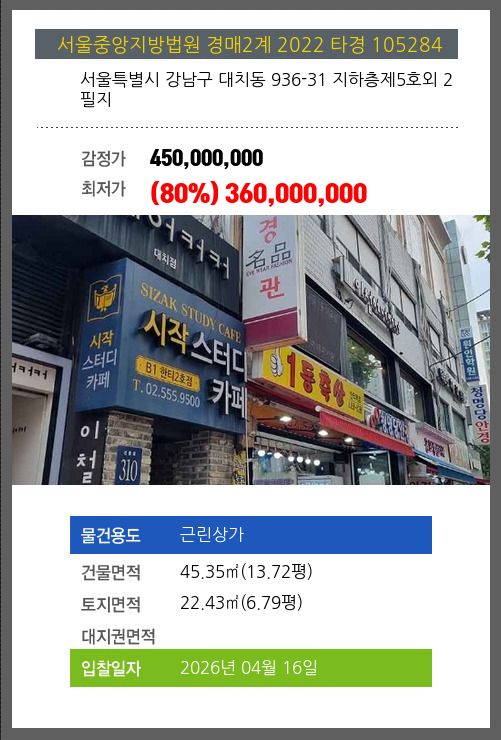 사건번호 2022 타경 105284 본건은 서울특별시 강남구 대치동 936-31 지하층제5호외 2필지소재하는 근린상가경매 물건의 포스팅입니다. 건물면적 [ 45.35㎡ (13.72평) ]토지면적 [ 22.43㎡ (6.79평) ] 시세를 반영한